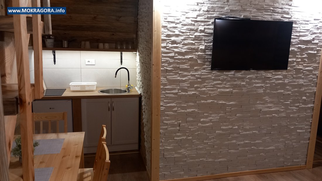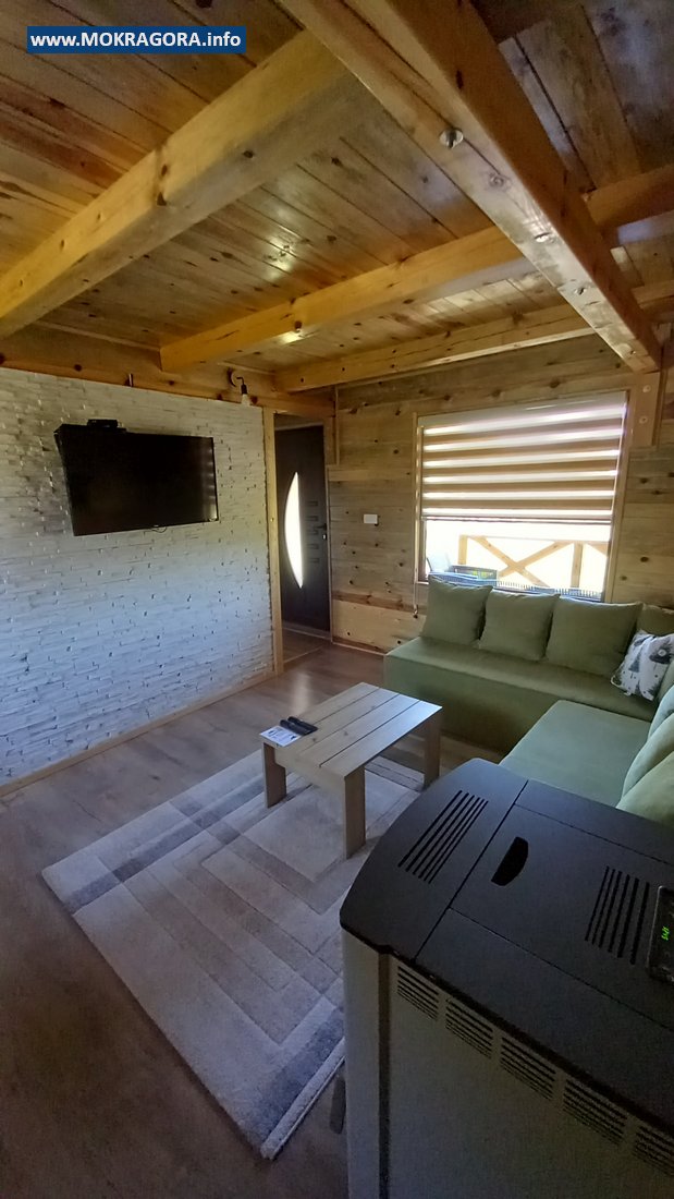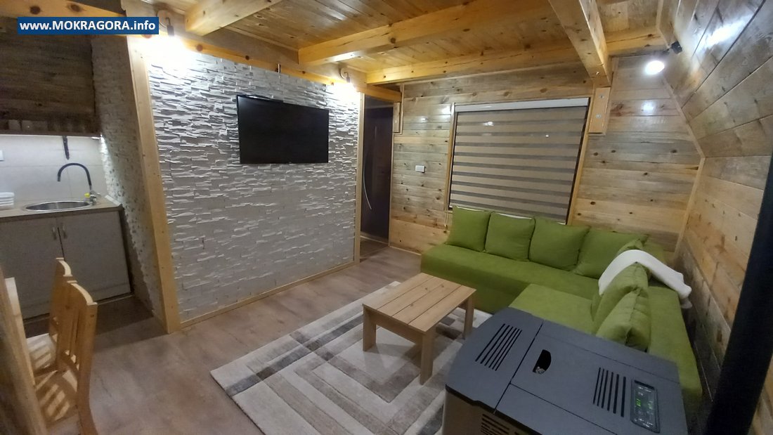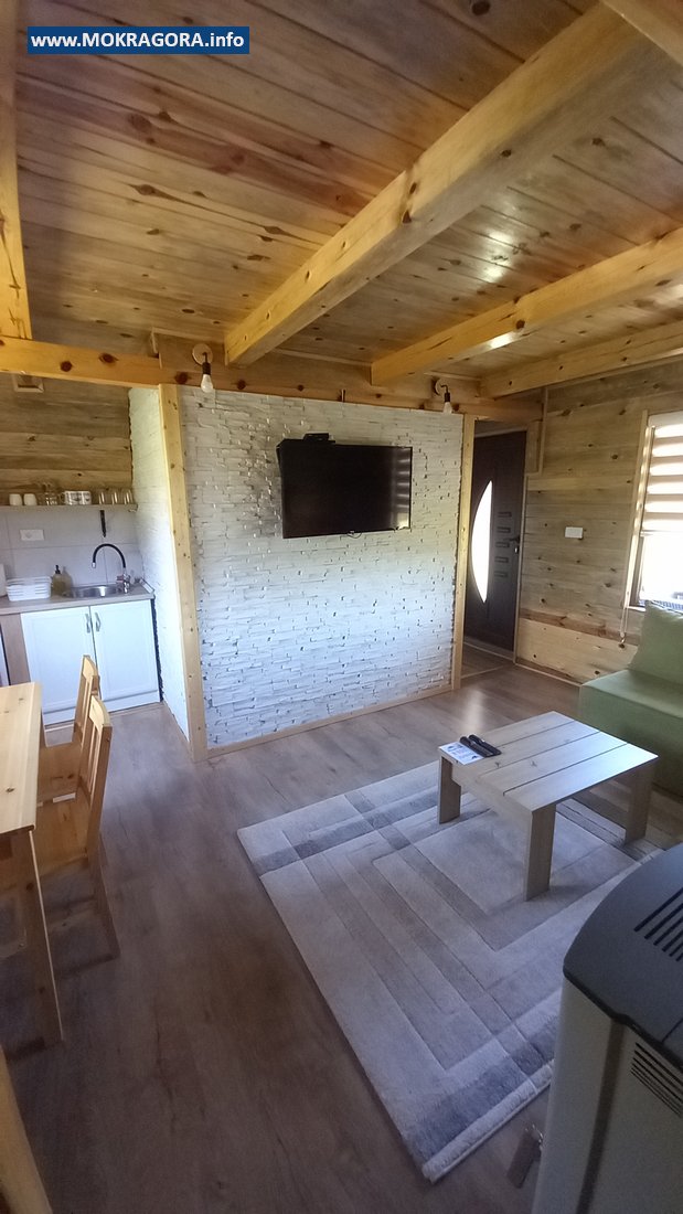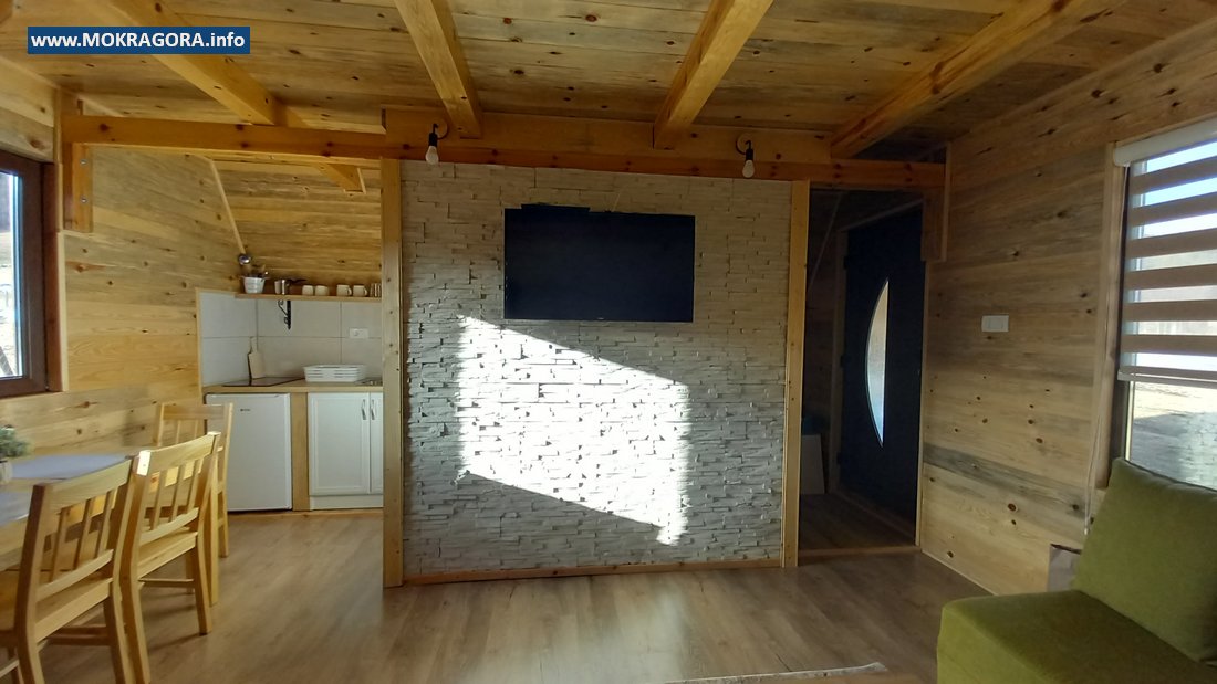 Svaka brvnara je za do 4 osobe i ima komplet opremljenu kuhinju, dnevni boravak i spavaću sobu sa